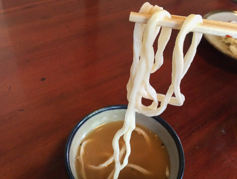 先ずはその手打ち麺ですが、もっちりとしたコシに重厚感のある歯ごたえ。またとても長く、不揃いなちぢれ。まさしく100%の手打ち麺です。食べ終わってから夕方まででその差も感じますが、機械練りよりも沢山の小麦を使用するため、とにかく腹持ちが良く、満腹感が続きます。